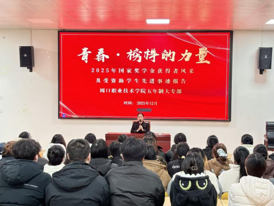 为全面落实立德树人根本任务,深入宣传国家资助政策的育人成效,强化学生感恩励志教育,充分发挥先进典型的示范作用,营造奋发向上、勇于拼搏的校园氛围,2025年12月22日下午,周口职业技术学院五年制大专部在中州校区图书馆四楼报告厅举办了2024-2025学年国家奖学金获得者先进事迹报告会。学管办主任王铮、资助专员种尘妍与300余名学生代表共同参加了本次活动。