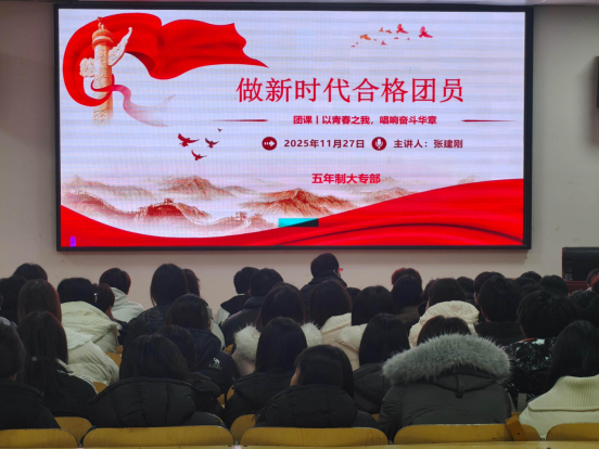 随着冬日的脚步悄然临近,2025年11月27日下午,周口职业技术学院五年制大专部于学院图书馆四楼报告厅成功举办2025年度入团积极分子系列团课的最后一讲。本次团课由五年制大专部党总支书记张建刚同志主讲,他以“做新时代合格团员”为核心主题,为在场的入团积极分子带来一场兼具思想深度与感召力的专题讲座,旨在进一步激励广大青年学子勇担时代使命、贡献青春力量。