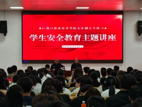 2025年9月29日,周职院五年制大专部特邀辖区城北派出所王秋平副所长,为2025级新生作安全教育主题讲座。讲座由学院副主任闻杰主持,通过丰富翔实的内容与鲜活生动的案例,带领同学们沉浸式学习安全知识,切实增强防范意识。