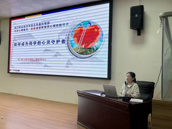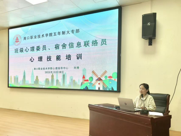 为进一步提升班级心理委员和宿舍信息联络员的朋辈心理互助能力,加强心理工作队伍建设,10月28日,五年制大专部组织开展2025年秋季学期班级心理委员和宿舍信息联络员心理技能培训。本次培训由五年制大专部副主任闻杰主持,邀请我校心理指导中心刘青老师担任主讲,五年制大专部学管办主任王铮、22级‑25级全体班级心理委员及宿舍信息联络员参加培训。