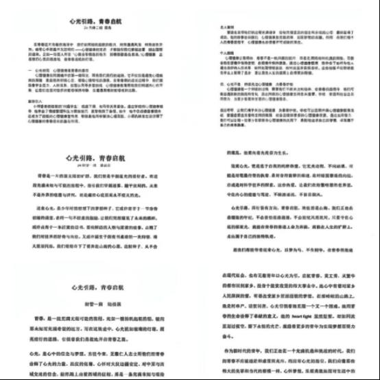 同学们围绕主题,结合自身学习、生活与思考,以真诚的笔触展现多样的心灵图景:有的讲述如何在迷茫与困境中寻得一束光、重获前行的勇气;有的分享对青春期困惑的觉察,以及对未来方向的清醒展望;也有的记录了在人际交往、学业压力中的点滴感悟与成长蜕变。文章情感真挚、视角丰富,既有细腻的自我剖白,也不乏对成长的深度思考,生动呈现出当代青年学子蓬勃的内心世界与积极向上的心理面貌。